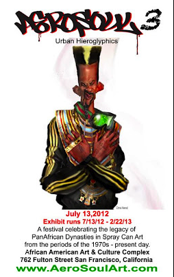 “That’s right ‘chall… AeroSoul, the world’s most comprehensive body of work focusing on the African/Black experience in Spray Can Writing Culture is coming to SanFrancisco California this summer July 13th-15th. The Exhibit will break historical ground at the prestigious African American Art & Culture Complex in San Francisco’s Fillmore district. 2012 marks the 3rd year for this annual Pan-African Spray Can Art Festival. AeroSoul 3, “From Khemet to Aztlan” will feature a body of work accentuating the African presence in art from Ancient Africa to the early African presence in the western hemisphere through the style lens of HipHop Calligraphy and iconography. This collection work and artifacts will represent some of the worlds most skilled muralist and illustrators in the African Diaspora. Aerosoul3 will chart the historic evolution of Spray Can Writing Culture from it’s East Coast(New York City/Philadelphia) origins to it’s style successors world wide through the narrative of the African experience. Artist from across the United States, Europe and West Africa will converge for this annual festival to celebrate the African Legacy in Spray Can Writing Culture as well as joining together to paint a Mural in the tradition of the HipHop genre. The Gallery exhibit will run a full 6 month period from July 2012-February 2013. During the Opening weekend an Artist panel from around the globe as well as representatives from different dynastic periods will speak about the state of the art and their rich experience. This year AeroSoul 3 is proud present the Youth edition of the exhibit that will run congruently at the AAACC. The Youth show will highlight the young and upcoming masters of the craft that have been engaged in programs provided by AeroSoul Art instructors. The AeroSoul line up is very impressive this year with a cast of writers from NewYorks 1970’s era, Riff170, Slave TF5, Butch2,Tean TMT, Kade TMT, Shame125, Sak MBT, and Soon to name a few. Mark your calendars folks, this historic event to promote the legacy of writing culture and end youth violence through art is not to be missed. For more info go to http://www.AeroSoulArt.com and http://www.AAACC.org