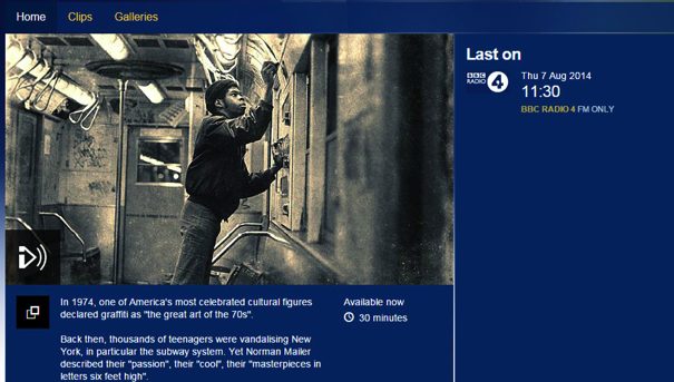 BBC Radio 4 meets some of those who defied the law (and their parents) and diced with death including pioneers such as Riff 170, Jester, Coco 144, Flint Gennari, and Tats Cru. Their efforts have been replicated far beyond New York – in art galleries and in the hands of Arab Spring protesters – and yet their aspirations were largely apolitical: they were chasing fame and the acceptance of their peers.