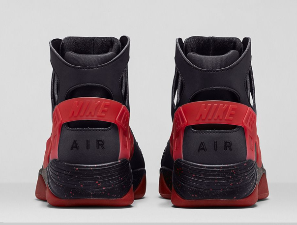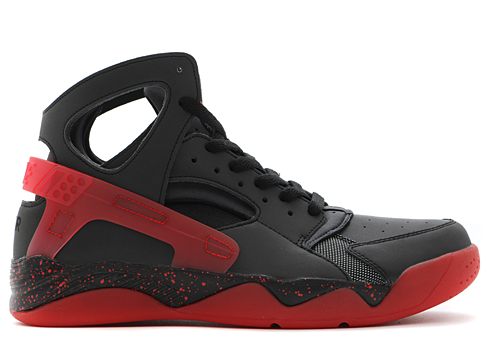 A hardwood classic, the Air Flight Huarache emits cold tones with a reflective, all-black leather exoskeleton. Inspired by the fit of a waterski boot, a black neoprene inner-sleeve can be seen through mid-foot cutouts, reducing the amount of material while maintaining its structure. A speckled midsole with red accents around the heel and outsole add small punches of color”.