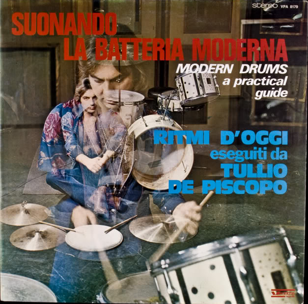 “SUONANDO LA BATTERIA MODERNA (MODERN DRUMS, A PRACTICAL GUIDE) Lp by TULLIO DE PISCOPO. Original Italian pressing on VEDETTE label (VPA 8179), from 1974. Infamous solo debut recording from Italy’s premier funky drummer. Tullio was an indemand studio player used for key Italian Library / funk and jazz related sessions during the early ’70s. He played drums for Sante Palumbo / Mirageman on the Thunder & Lightning session / Valdambrini – Piana Quintet on the Afrodite Lp / Barigozzi on the Woman’s Colors Library and Vedette label owner and electronics pioneer, Armando Sciascia used certain rhythm trax from Suonando La Batteria for the Violin Reactions Library. Absolutely killer beats / drum loops and percussion sounds from freestyle funk / breakbeat / proto hip hop to punishing samba and afro cuban jazz. The Coagulation track from his debut single (released 2 years before) is given an incredible makeover into an alternative, even funkier theme called MEDIUM ROCK.”