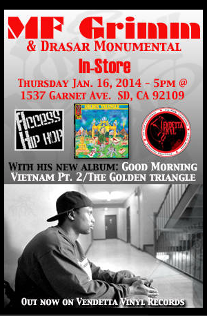 MF GRIMM & I will be in the beautiful beach city of San Diego, California this Thursday at Access Hip Hop for a little in-store action….We have a few surprises up our sleeves, so if you live in the Southern California region make sure you come out and celebrate the release of GOOD MORNING VIETNAM 2 with us…